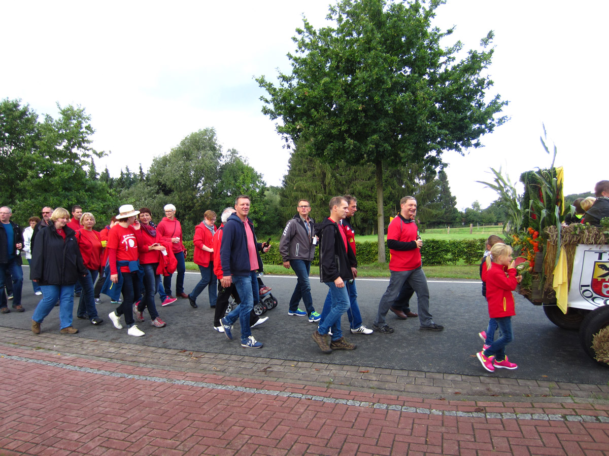 d Korte zum Schmücken. Viele fleißige Hände sortierten das geschnittene Korn, banden daraus Kränze für die Räder des Wagens sowie des Traktors und schmückten die Seitenteile. Ein Extra-Dank geht an Hildegard Wiebking, die mit geschickten Händen und viel Erfahrung die meisten Kränze band und ihre Kenntnisse weitergab, so dass Angela Förthmann unseren TSV-Schriftzug in Heimarbeit mit Buchs bestücken konnte.